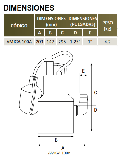 | AMIGA 100A | 1/2 | 1 FASE | 115V | 19 mm | 1.25" | 7 m / 140 lpm |