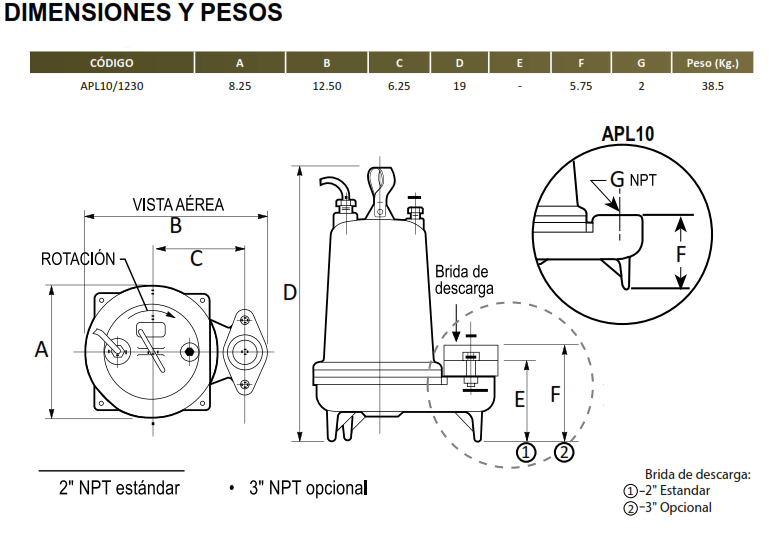 | MODELO | HP | MOTOR | VOLTAJE | DESCARGA HEMBRA NPT (plg) | PASO DE SÓLIDOS (plg) |
