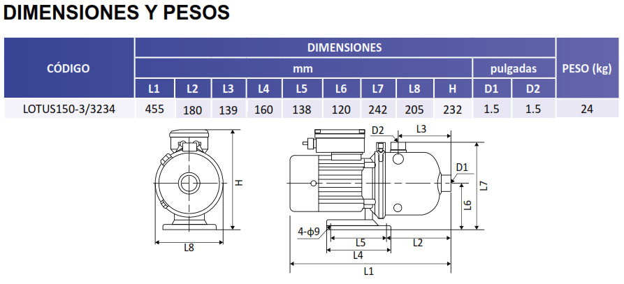 | LOTUS150-3/3234 | 2 | 3 FASES | 230V/460V | 1.5" | 1.5" | 45 m / 64 Psi |