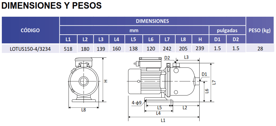 | LOTUS150-4/3234 | 3 | 3 FASES | 230V/460V | 1.5" | 1.5" | 60 m / 85 Psi |