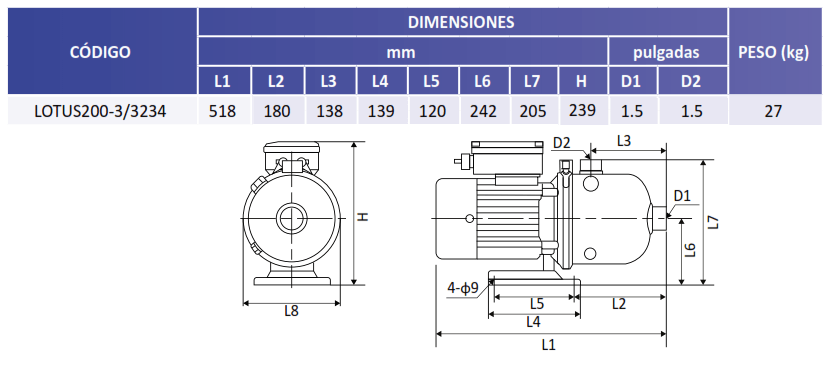 | LOTUS200-3/3234 | 4 | 3 FASES | 230V/460V | 1.5" | 1.5" | 58 m / 82 Psi |