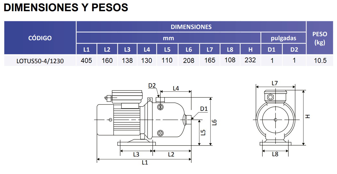 | LOTUS50-4/1230 | 3/4 | 1 FASE | 230V | 1" (25.40 mm) | 1" (25.40 mm) | 51 m / 72 Psi |