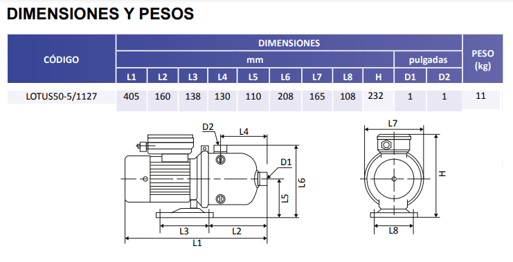 | LOTUS50-5/1127 | 1 | 1 FASE | 127 | 1" (25.40 mm) | 1" (25.40 mm) | 64 m / 91 Psi |