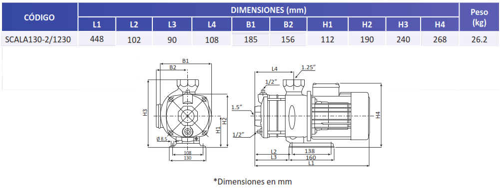 | SCALA130-2/1230 | 2 | 1 FASE | 230V | 1.5" | 1.25" | 54 m / 76 Psi |