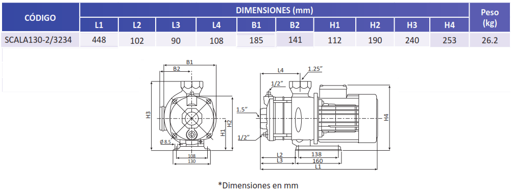 | SCALA130-2/3234 | 2 | 3 FASES | 230V/460V | 1.5" | 1.25" | 54 m / 76 Psi |